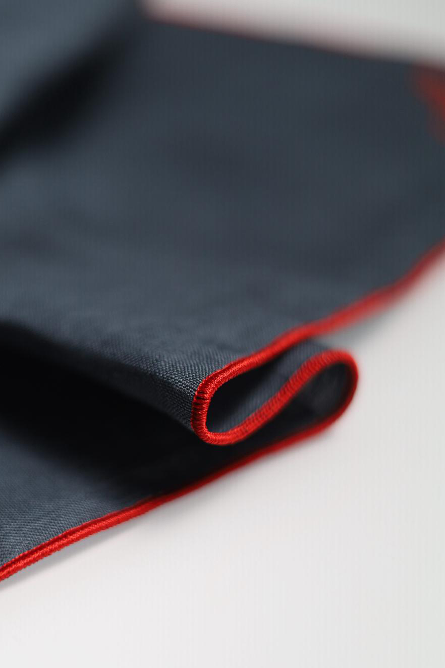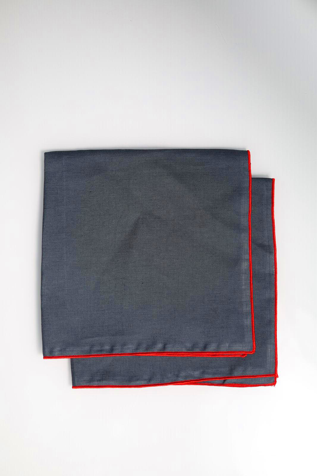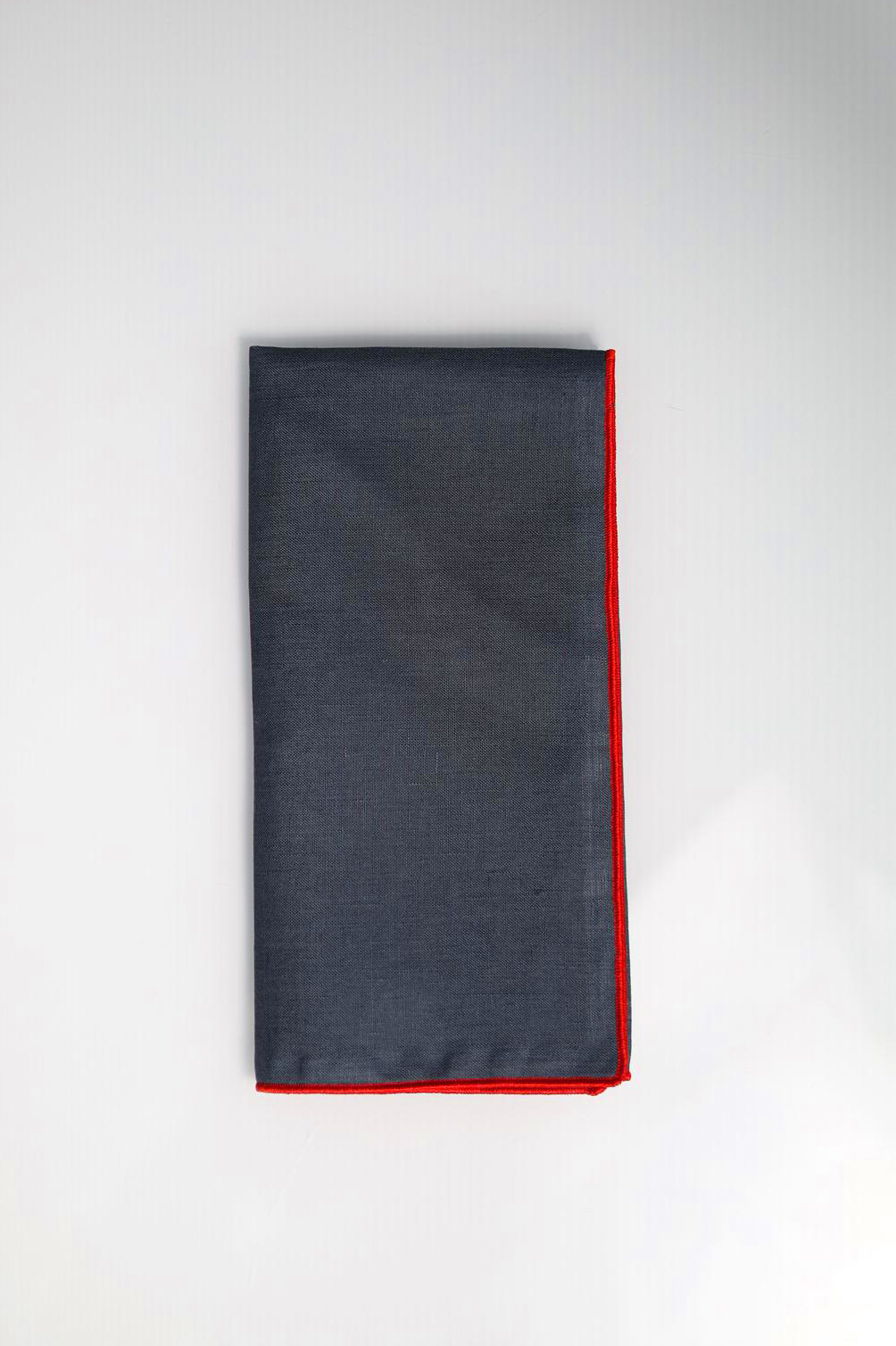 • Lenço cinzento com bordas vermelhas dobrado sobre fundo branco