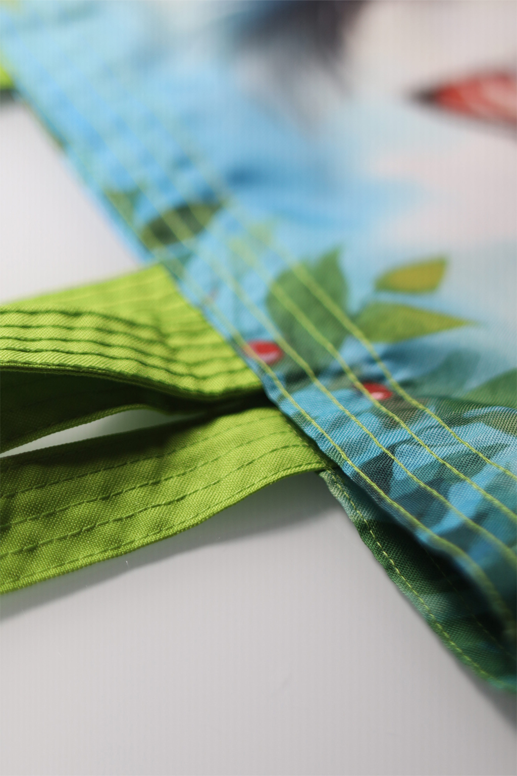 • Sacola reutilizável em tecido com alças verdes e padrão colorido